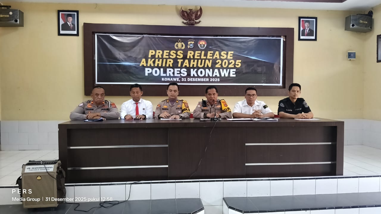 KITASULTRA.COM | KONAWE – Kepolisian Resor (Polres) Konawe menggelar Press Release Akhir Tahun 2025 pada Rabu, 31 Desember 2025. Kegiatan ini dipimpin oleh Wakapolres Konawe, Kompol Hasruddin, S.E., M.E., didampingi sejumlah pejabat utama Polres Konawe.